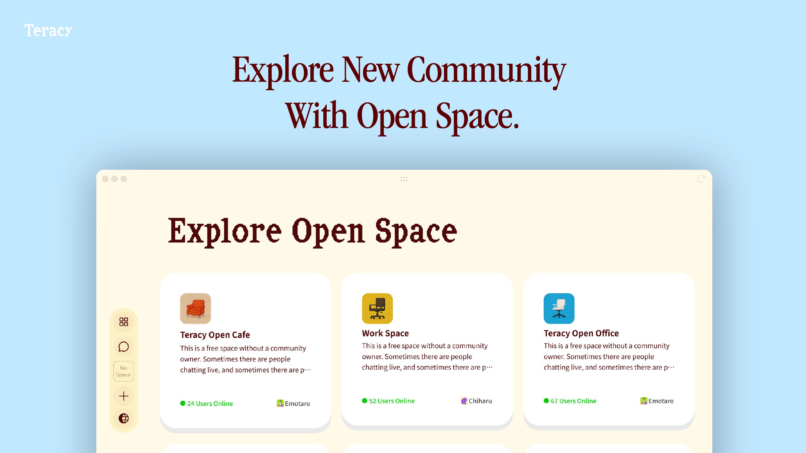 You can view currently public Open Spaces via the globe icon in the sidebar. (Spaces other than those operated by Teracy are now also visible.)